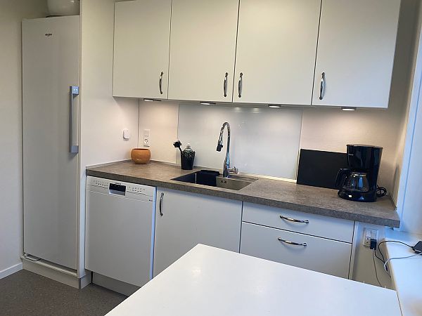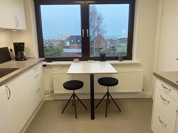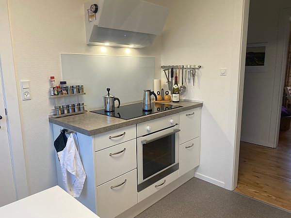 Die Küche ist voll eingerichtet mit allem üblichen Zubehör. Zwei Personen können dort mit Blick in den Garten und auf den Hafen sitzen. Eine kühle Vorratskammer schließt sich an.