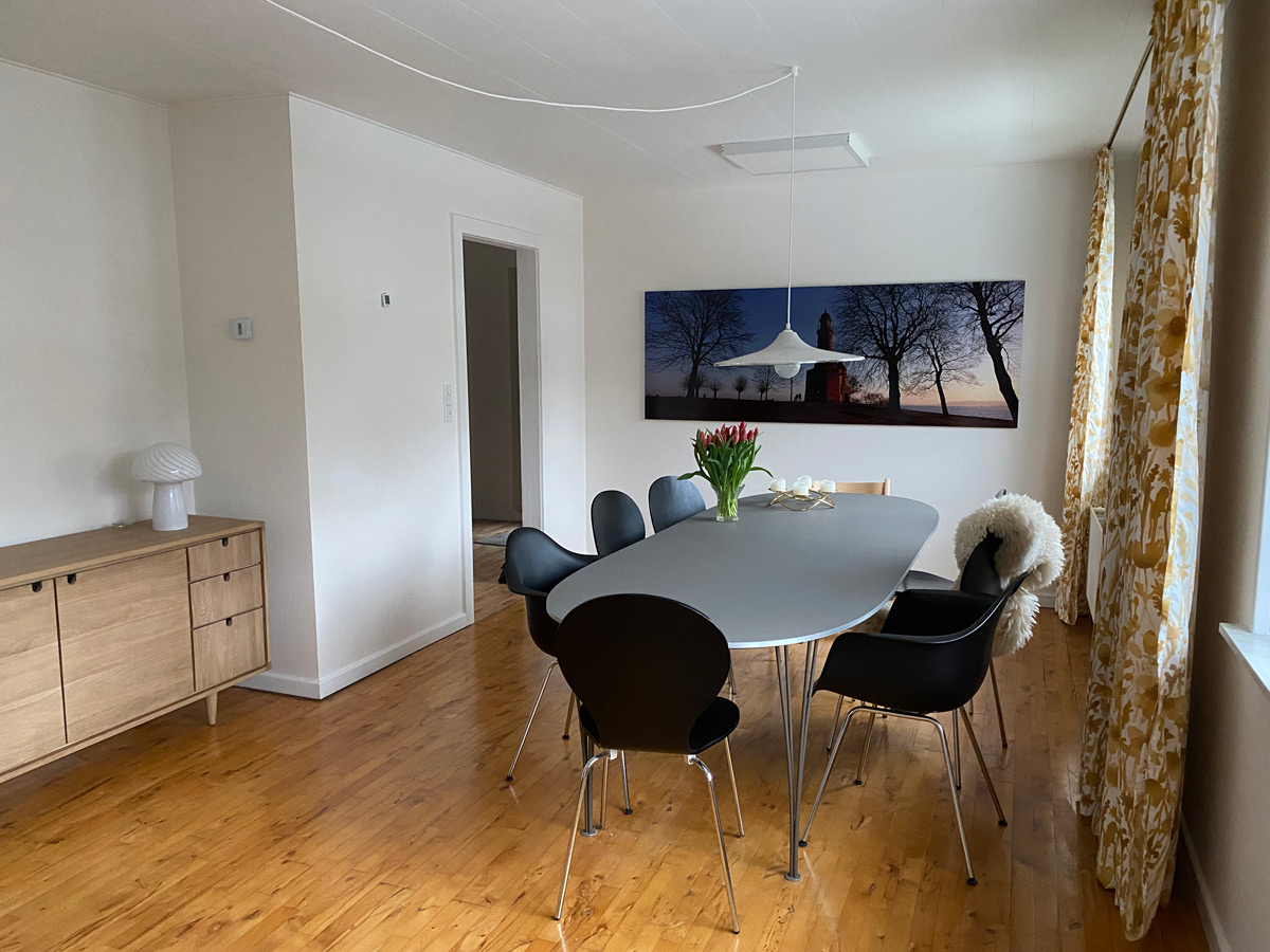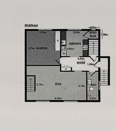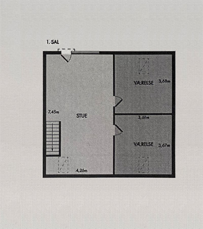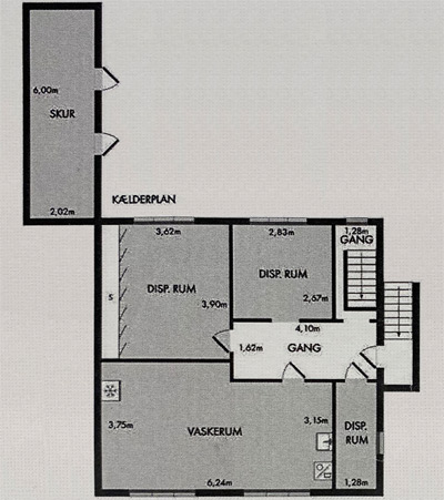 Im Erdgeschoß (STUEPLAN) kommt man durch einen kleinen Flur zu Küche, Bad, Schlafzimmer und Esszimmer. Von dort führt eine komfortable Treppe in das Obergeschoß (1. SAL), wo sich das geräumige Wohnzimmer und zwei Gästezimmer befinden. Das Haus ist voll unterkellert (KÆLDERPLAN).